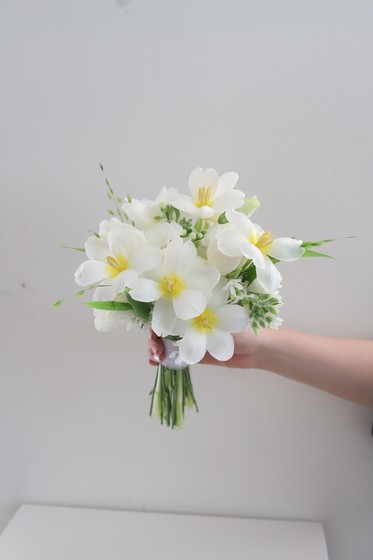 잎을 펼친 튤립을 메인으로 사용하여 깔끔하고 화려한 느낌의 부케입니다.