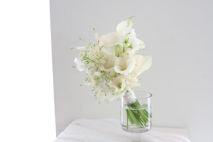 깨끗하면서도 깔끔한 화이트 카라를 사용한 부케입니다. 아스틸베가 들어가 여리여리하고 청초한 느낌이 듭니다.