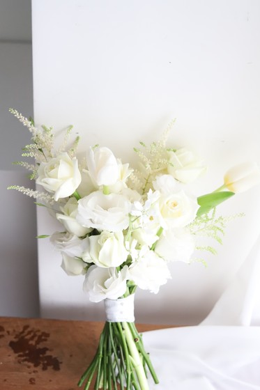 순결하고 청순한 느낌의 화이트 부케입니다. 환하고 깔끔한 느낌을 선호하는 신부님께 추천드립니다.