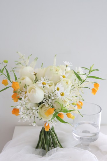 김연아 부케로 유명한 퓨어블론디 장미를 메인으로 잡은 부케입니다. 샌더소니아까지 추가하여 훨씬 고급스러운 느낌을 줍니다.